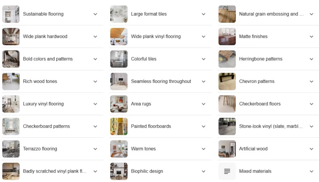 According to the latest google search results, there are 23 floor covering design trends that would proceed into 2026 year. Here we have picked some of the most relevant topics that is related to luxury vinyl floorings.